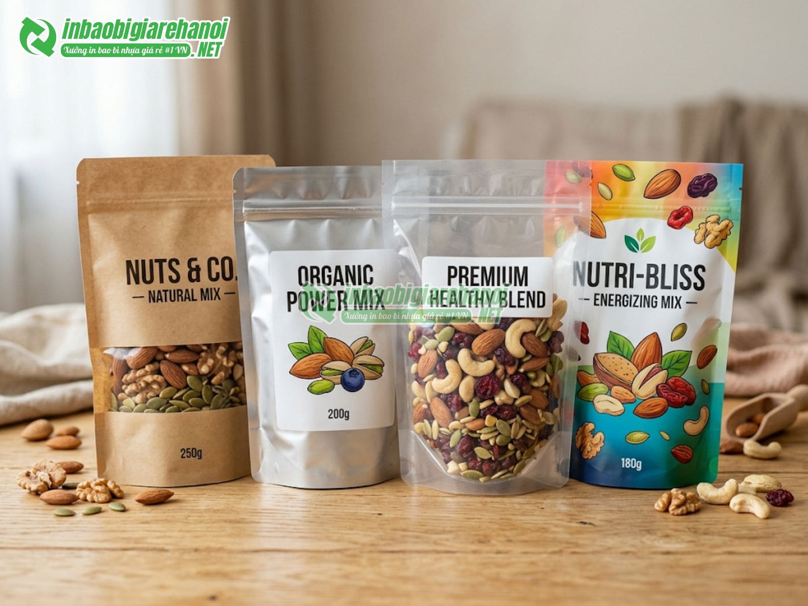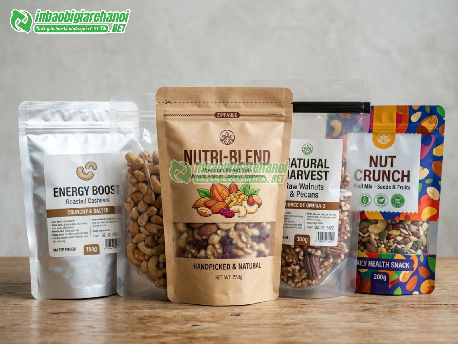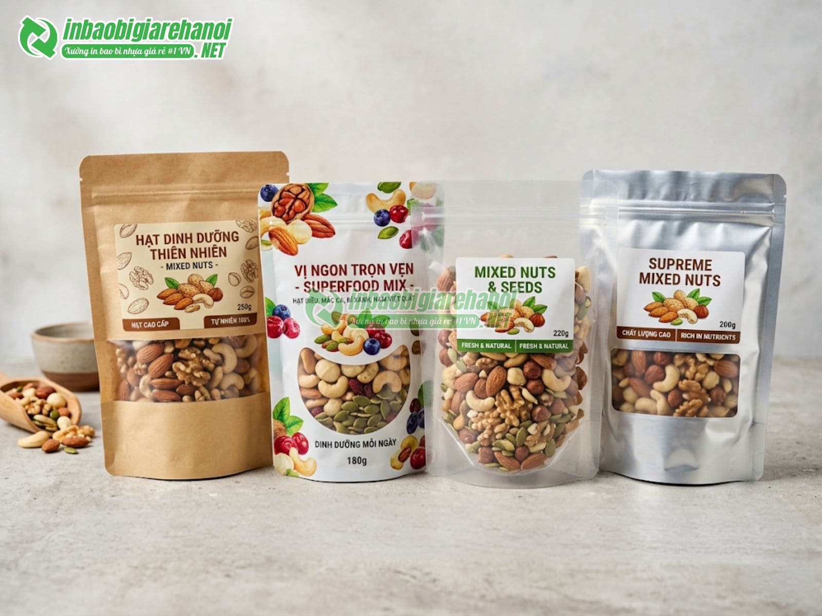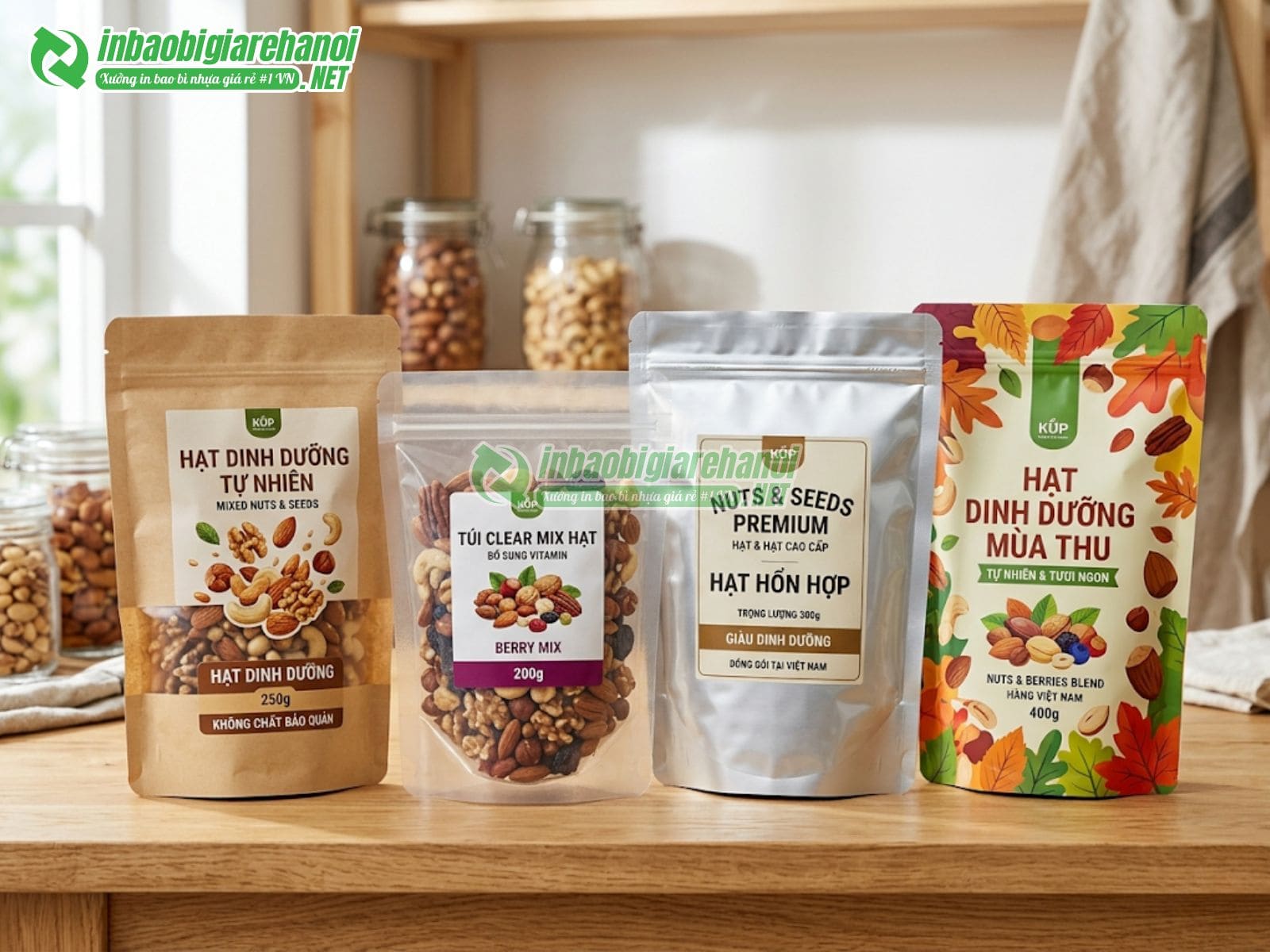 Bao bì hạt dinh dưỡng là giải pháp đóng gói then chốt giúp bảo quản độ giòn, ngăn ngừa ẩm mốc và giữ trọn giá trị dinh dưỡng cho các loại hạt như mắc ca, hạnh nhân, hạt điều. Tại inbaobigiarehanoi.net, chúng tôi chuyên sản xuất và in ấn các loại túi zipper, túi màng ghép phức hợp đựng hạt dinh dưỡng với mẫu mã hiện đại, sang trọng. Với ưu điểm in ấn sắc nét và giá thành rẻ tận xưởng, sản phẩm của chúng tôi không chỉ bảo vệ thực phẩm tối ưu mà còn là công cụ Marketing hiệu quả, giúp nâng tầm nhận diện thương hiệu cho doanh nghiệp của bạn.